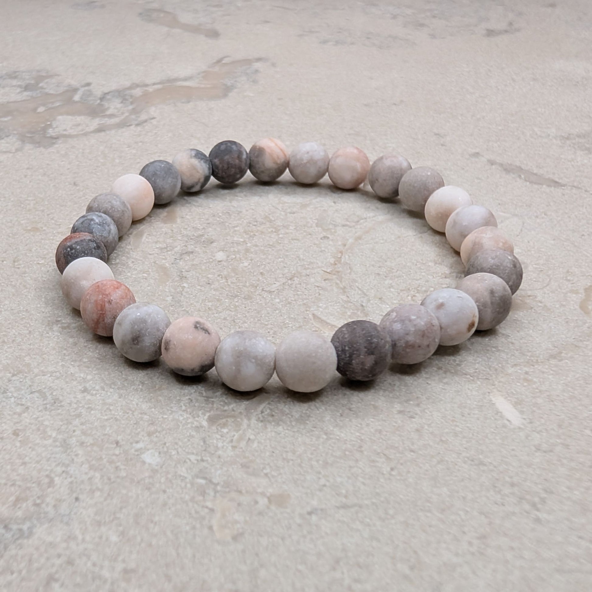 Bär med dig en strimma av solsken, varje dag. Detta fina och nätta armband är skapat med pärlor av matt Solsten i en mjuk palett av persika, rosa och grått. Det är en diskret men kraftfull påminnelse om livets ljusa stunder och glädjen i att låta ditt sanna jag skina.